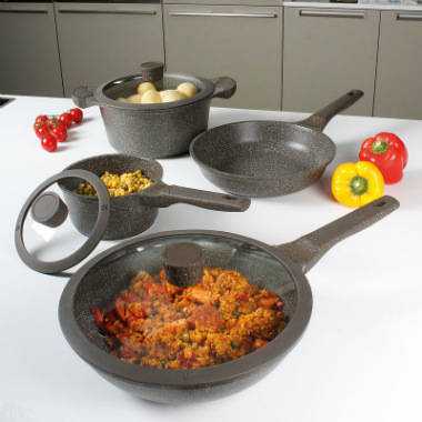 - Внешний вид. Каменное покрытие дает на поверхности посуды мелкие вкрапления, из-за чего внешний вид сковороды более привлекателен. Современные модели выглядят интересно. Когда используемые инструменты привлекают глаз, желание использовать их возникает само собой, а это улучшает кулинарные способности повара.