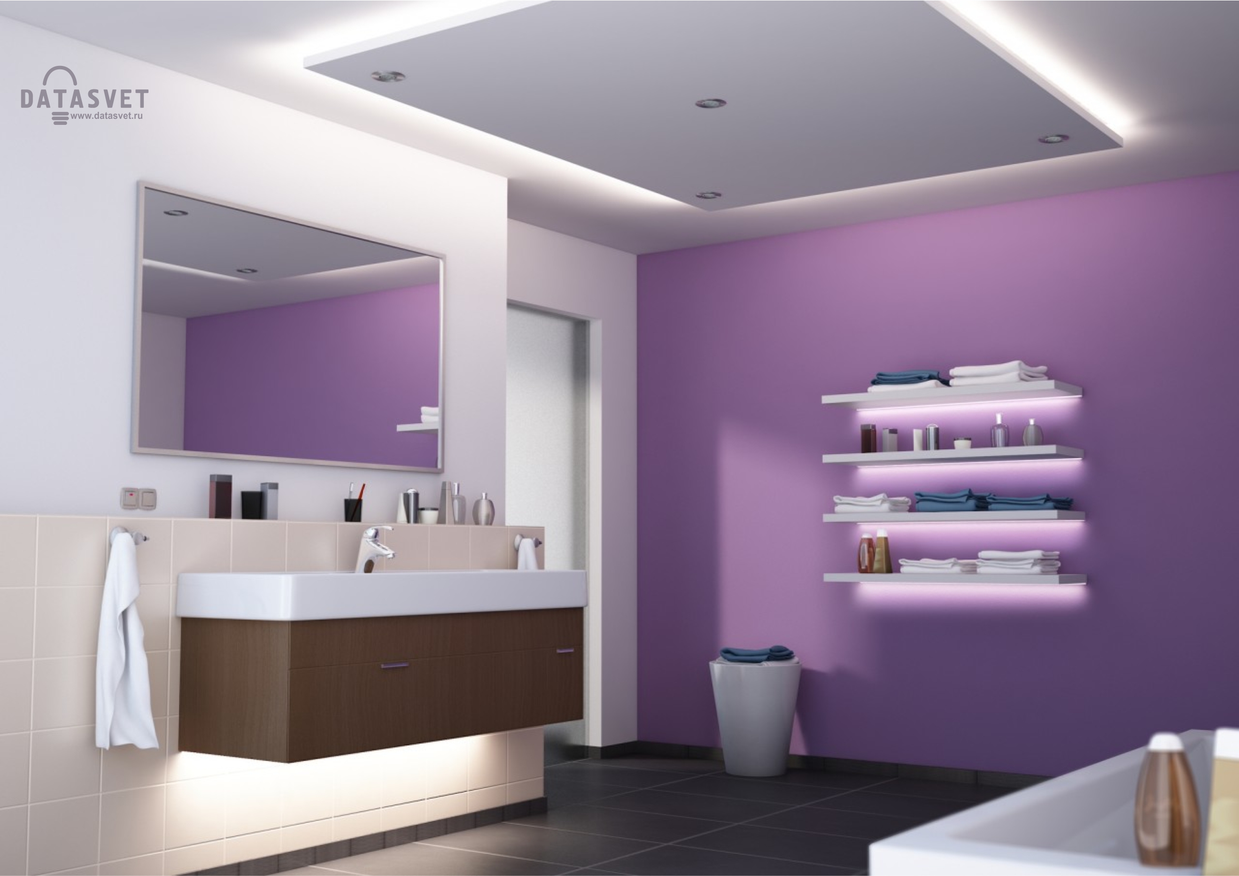 Но для освещения ванной можно использовать не только точечные светильники или настенные бра со светодиодными лампами. Использование светодиодной декоративной подсветки поможет реализовать различные дизайнерские идеи и придать интерьеру ванной особую красоту.
