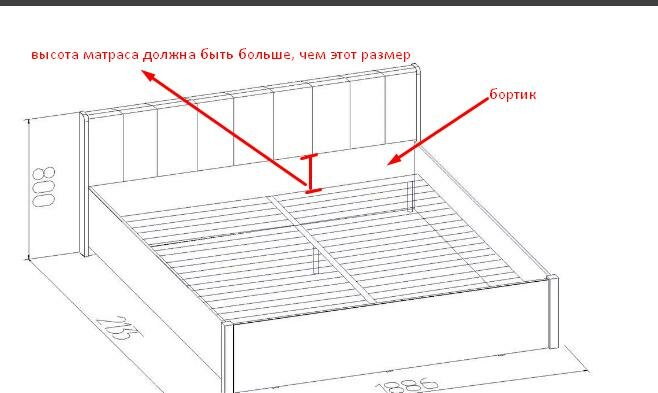 Глубина кровати – один из главных параметров, по которому определяют подходящую высоту матраса. Правильно подобранный вариант должен возвышаться над царгой не менее чем на 5 см. Чтобы подобрать матрас подходящей высоты, придется измерить расстояние от ламеля до самой выступающей точки боковин кровати, затем к полученному показателю добавить 5-10 см. Это и есть идеальная высота матраса.