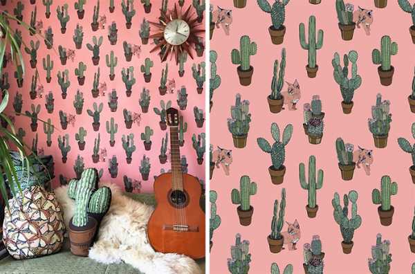 Розовое великолепие с маленькими котятами и разными видами кактусов! Нам кажется, что это очень милый вариант для детской комнаты.