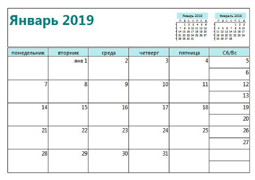 Непрерывный ежемесячный календарь для Excel
