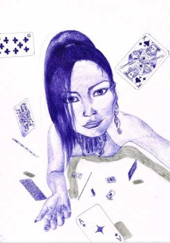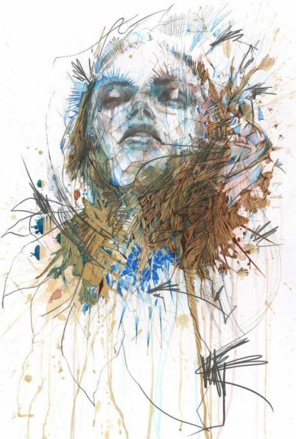 Вообще-то Карне Гриффитс (Carne Griffiths) всегда работал с тушью и водой. Но однажды на его рабочем столе стоял стакан с коньяком, который случайно выплеснулся на незаконченную работу. И художник с удивлением заметил, что в тех местах, куда попал алкоголь, краска быстрее впиталась в бумагу и стала ярче. Тогда Карне стал экспериментировать с различными жидкостями, выбрав в итоге чай и алкоголь.