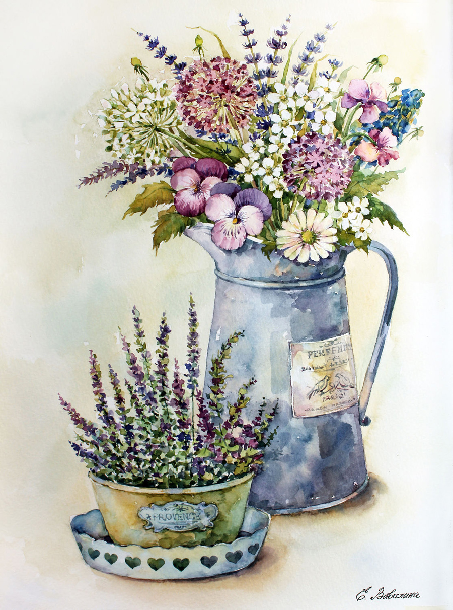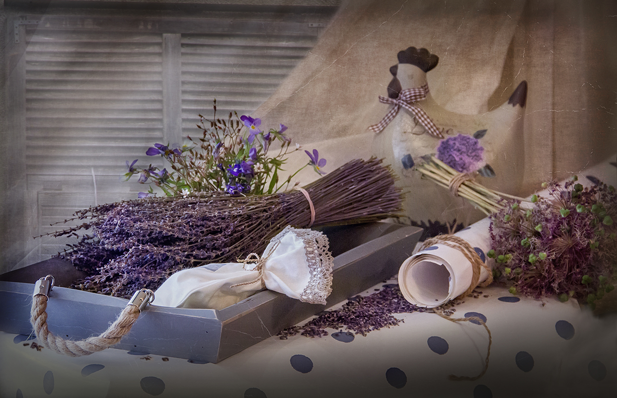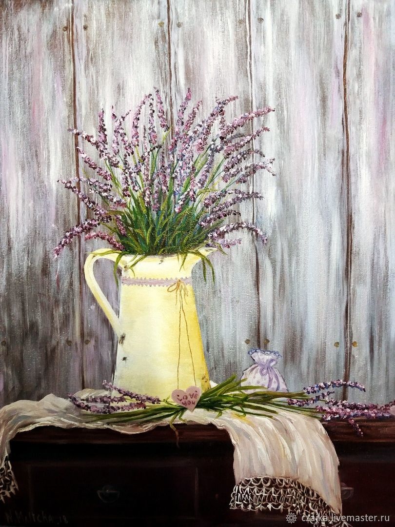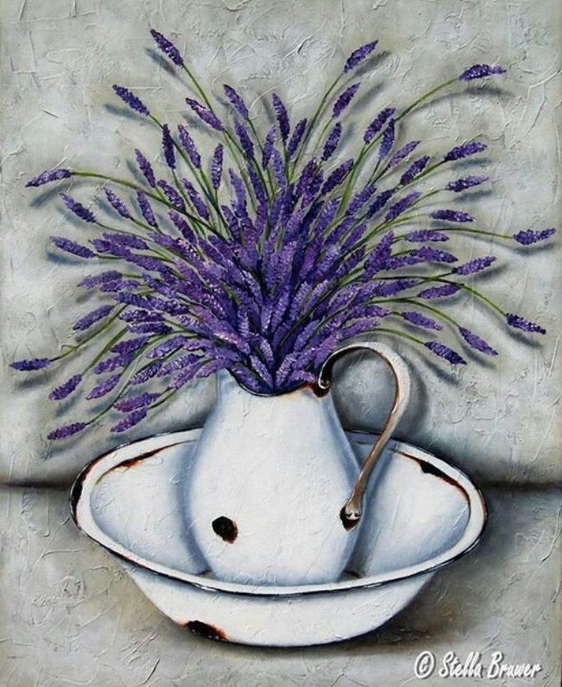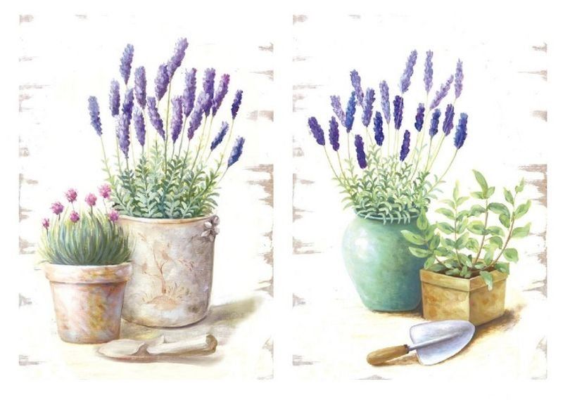 . Лаванда – «визитная карточка» Прованса, поэтому полотна с ней всегда будут беспроигрышным вариантом. Наряду с лавандой нередко применяют изображения роз, но не красных, а приглушенных бежевых, пудровых. Картины с розами украсят спальню молодой девушки, семейной пары. Во многих случаях цветы изображаются в старых вазах, треснувших от времени кувшинах.