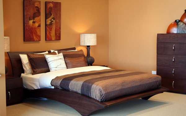 Куда более тщательно необходимо отнестись к оформлению такой комнаты, как спальня в африканском стиле. Так как это помещение служит для сна и отдыха, убранство ее не нужно загромождать большим количеством аксессуаров. Достаточно большой удобной кровати с деревянным обрамлением в общем стиле, тематические подушки и покрывала. А дополнительные предметы, такие как кресла, сундуки, комод, лучше использовать на натуральной основе: бамбук, тростник, ротанг.
