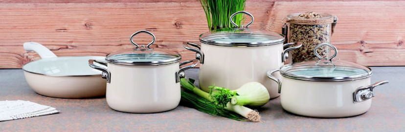 Однако сейчас под керамической посудой часто подразумевают посуду из металла со слоем керамического покрытия и специальной эмали. Такие кастрюли эстетичны и красиво смотрятся в любом интерьере, жаропрочны и долго держат тепло, что позволяет готовить блюда, которым нужно «доходить» (например, плов).