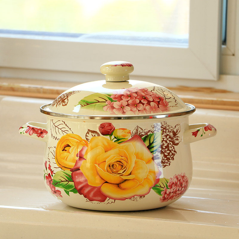 Эмалированные кастрюли очень недороги, при этом отличаются симпатичным дизайном (любой цвет и узор на выбор).