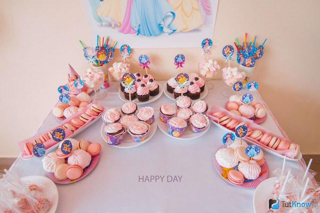 - Обычно стол для сладостей оформляют в одном стиле, который соответствует вашему торжеству. Сегодня модно посвящать детские праздники определенным темам, сказочным сюжетам, героям мультфильмов.