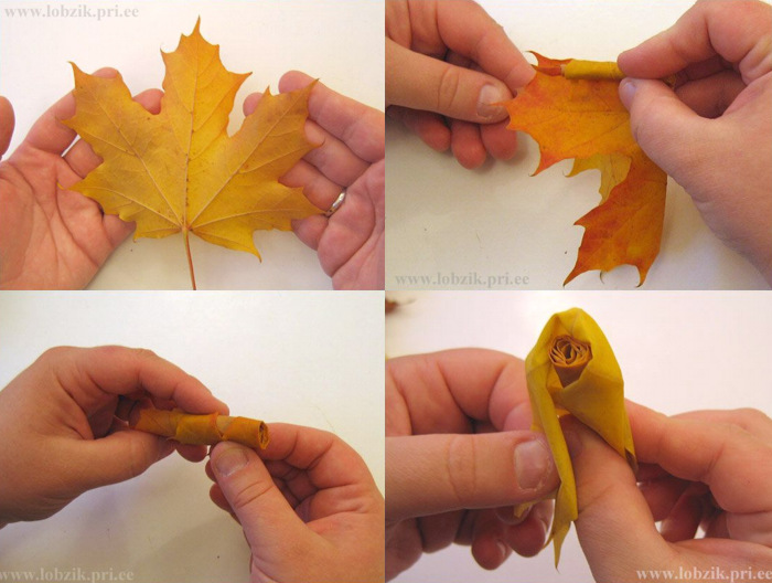 Очень легко сделать из кленовых листьев розы, которые потом собрать в один большой букет. Эти цветы будут радовать вас всю зиму. Плюс это интересная идея для маленького сюрприза девушка от парня. Делаются эти розы элементарно — просто складываете кленовые листья и наматываете на заготовку. Не забываем отогнуть края, как у настоящей розы. Вот подробный пошаговый мастер класс по изготовлению розы из кленовых листьев и букета из них: