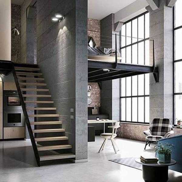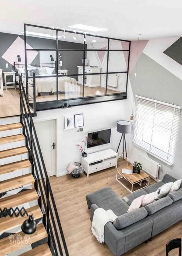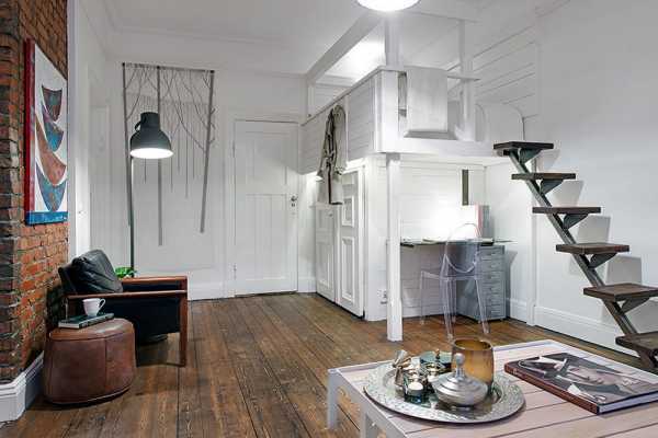 1. Обязательно подумайте о лестнице на новый этаж: она не должна быть крутой и скользкой, должна располагаться в удобном месте (обычно – сбоку), не мешать и не перегораживать первый этаж комнаты. Лестницу, как и все прочие элементы, можно оформить многофункционально, например, собрать её из ящиков, тогда пространство под лестницей не будет простаивать и принесёт немало пользы.