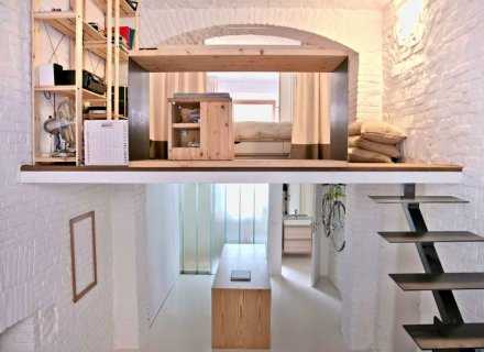 Вот ещё вариант двухуровневого жилья, представленный итальянской фирмой Studioata. Чётко отделённый от остального помещения контрастной деревянной полкой, украшенный плавающей лестницей, этот домашний кабинет добавляет индивидуальности обычной квартире-студии.