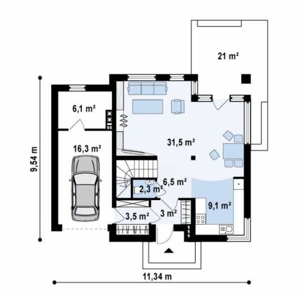 На фото ниже одни из самых удачных и интересных проектов первого этажа для жилого дома средней площади. Здесь есть гараж, подсобное помещение, лестницы, гостевой санузел. Жилая площадь представляет собой гостиную-студию с зонами для приготовления и приема пищи. Из гостиной есть выход на террасу.
