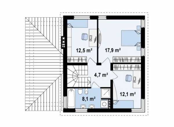 Еще один удачный пример планировки второго этажа, где находятся три спальни различных размеров, большой санузел и просторный холл. Из самой большой спальни предусмотрен выход на балкон.