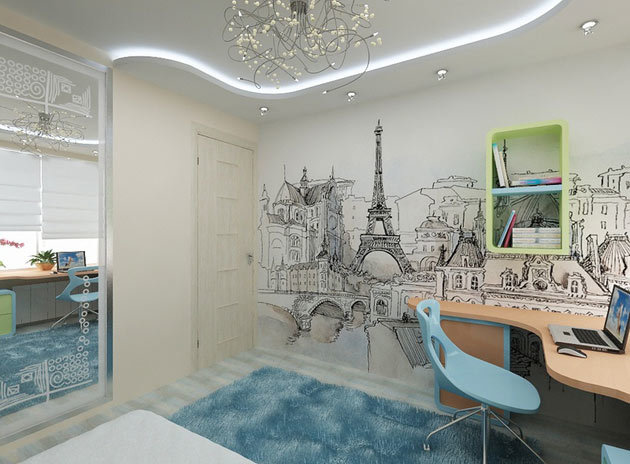 Синие и зеленые полосы украшают стены этой девичьей комнаты в парижском стиле, разработанной B Different.
