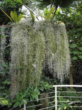 Тилландсия уснеевидная (Tillandsia usneoides), также ведущая полностью атмосферный образ жизни, снабжена густыми трихомами, которые усваивают влагу и питательные вещества прямо из воздуха. Растение напоминает заросли мха, которые свешиваются с ветвей деревьев, за что ее часто называют Испанским Мхом. Корней у растения нет, оно состоит из разветвленных побегов, на концах которых при хорошем уходе распускаются небольшие, но очень изящные желтые цветки. При размещении в домашних условиях этот вид не нуждается даже в блоках, его подвешивают в виде пучков. В остальном условия содержания не отличаются от других атмосферных тилландсий. Изредка можно полностью погружать растение в теплую воду на несколько минут. Летом полезно выносить на свежий воздух в место, защищенное от прямого солнца и дождя.