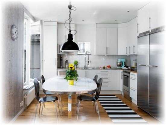 Когда кухня узкая и тесная, то нужно использовать все средства для того, чтобы визуально увеличить её пространство. Как ни странно, но и в этом случае ковёр будет полезен. Например, узкий длинный коврик с горизонтальными полосами зрительно сделает комнату шире. А если полосы цветные, то интерьер будет выглядеть более интересным и динамичным.