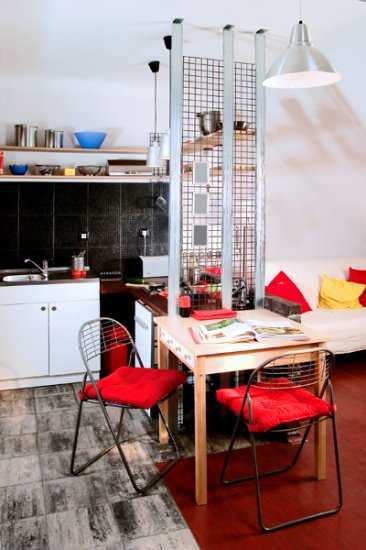 Однокомнатные квартиры сегодня часто оформляют в виде студий. Это помогает зрительно избежать чувства тесноты, но при этому необходимо грамотно зонировать пространство. И отличным помощников в разрешении этого вопроса станет ковёр. Чтобы он гармонично вписался в интерьер кухни, подбирать его цвет стоит таким образом, чтобы он совпадал с оттенком кухонного фартука, столешницы или посуды, стоящей на виду.