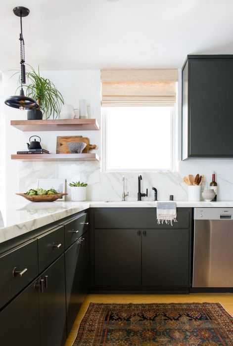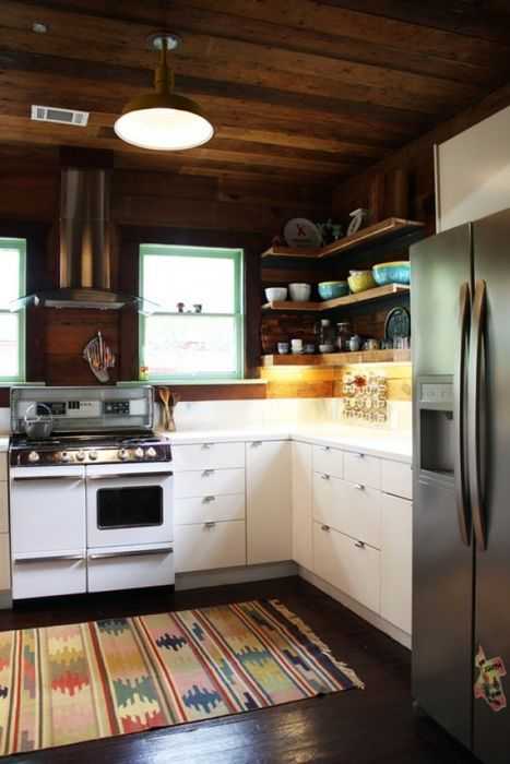 Если кухня выполнена я водной цветовой гамме, и имеет монотонный интерьер, то в этом случае просто не обойтись без акцента. Сегодня очень популярны ковры с этническими и восточными мотивами. Такие аксессуары украшают кухни совершенно разных стилей – от классического до лофта. Ковёр привнесёт в интерьер изюминку и сделает пространство исключительным. Что касается практичной стороны, то выбирать нужно тонкие безворсовые ковры, которые легко чистить щёткой или стирать в стиральной машинке.