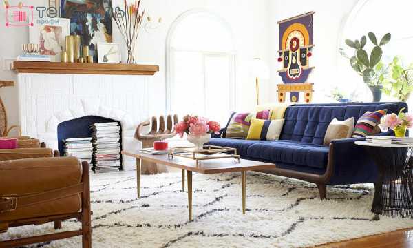 Для небольших уютных гостиных подойдут пушистые ковры из полипропилена- Необычно выглядит сочетание белых с голубым ковров со светлой мебелью. Несмотря на то, что синий и его оттенки – холодные тона, как правило, такие классические ковры без особых проблем вписываются в интерьер, пример на фото: