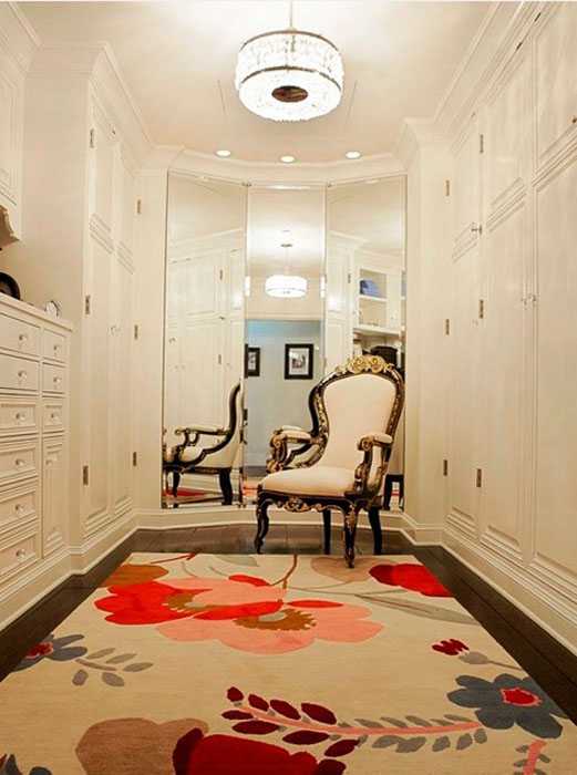 Ковёр с крупным цветочным узором яркой раскраски станет источником потрясающего контраста в белом классическом интерьере. Не нужно бояться крупных рисунков в небольших комнатах – они способны привнести жизнь в пространство. Особенно если там мало мебели.
