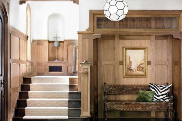 Ковёр с простым графическим узором очертит лестницу классической прихожей с панелями. Современный узор повторяет геометрическую форму светильника и окна в верхней части стены над скамьей.