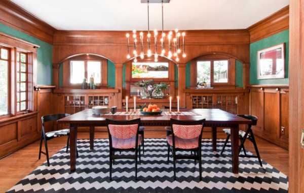В традиционную столовую с деревянными панелями современный чёрно-белый ковёр привнесёт энергию. Необязательно выбирать узор «зигзаг», похожий эффект продемонстрируют и обычные полоски.