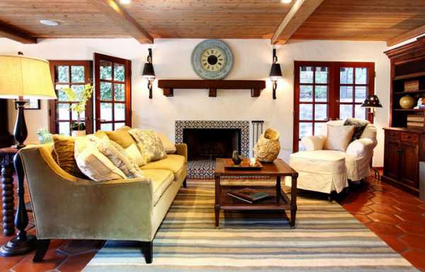 Полоски на ковре могут гармонично повторять цвет мебели, часов, создавая уютную атмосферу традиционного дома в средиземноморском стиле. Хотя ковёр, казалось бы, и не соответствует дизайну дома, его цвета связывают все элементы в единое целое.