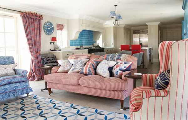 Современный ковёр пришёлся как нельзя кстати в традиционном интерьере, представленном в красно-бело-голубой цветовой палитре. Ограничение лишь