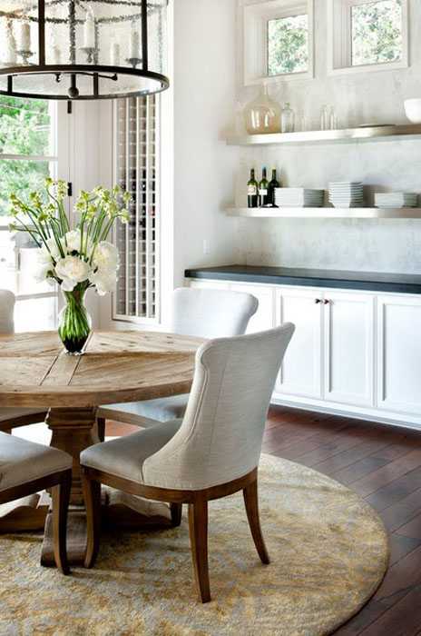 Круглый ковёр определяет зону столовой в современном рустикальном стиле.
