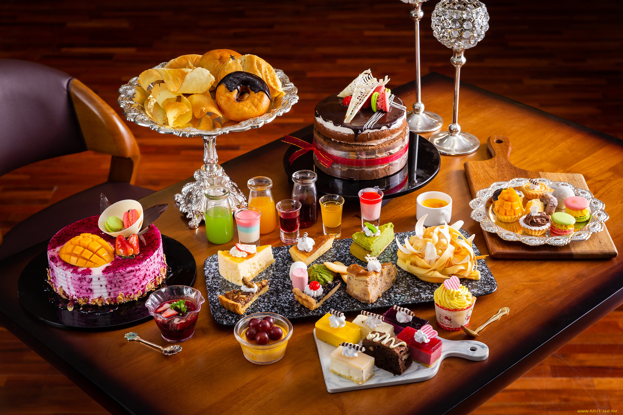- Красиво оформленный десертный стол с разнообразными вкусными пирожными, десертами и угощениями.