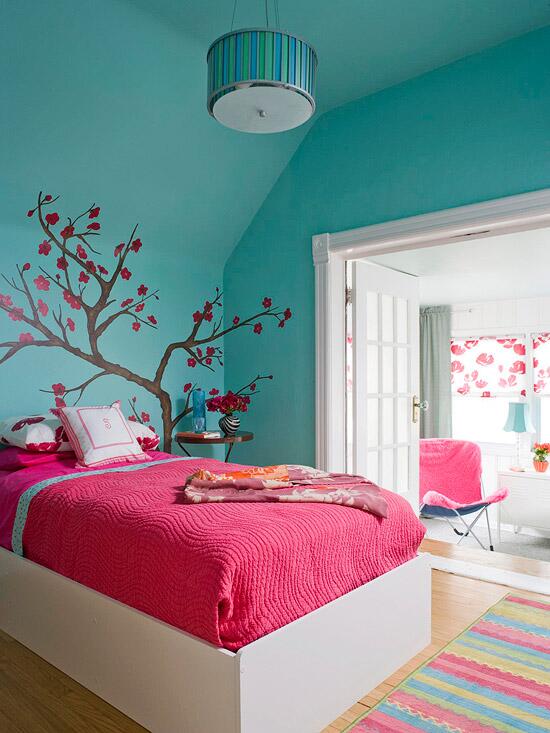 Такой рисунок будет интересен в детской комнате или спальне. Можно окрасить основную часть поверхности темным оттенком, например, бирюзовым, а дерево выполнить в белом цвете.