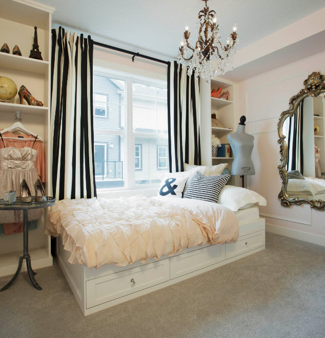 - Можно воспользоваться приемом, подходящим под любую спальню. Сочетание черного и белого цветов создает деловой вид, который всегда будет выглядеть стильно.