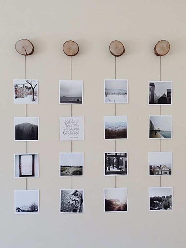 На свисающие со струны лески, веревки или даже цепи можно повесить несколько картин, менять их расположение и высоту. Конечно, чтобы прикрепить карниз, необходимо воспользоваться дрелью, но отверстия будут находиться в незаметных местах и их будет значительно меньше, чем требуется для того, чтобы повесить несколько отдельных рамок. Нестандартным решением будет прицепить фотографии непосредственно к леске обычными прищепками. Особенно выгодно это смотрится при наличии двух или трех параллельно натянутых струн. Таким способом можно создать целую фотогалерею, которая станет основным декоративным элементом в комнате.