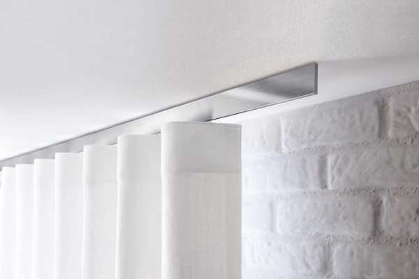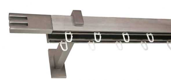 Струнный карниз из алюминия имеет серебристый цвет и крепления серого оттенка