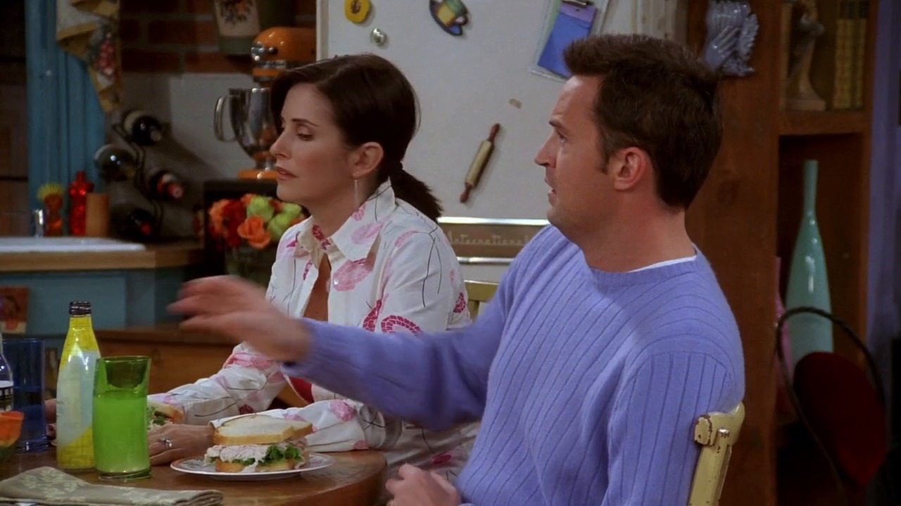 Она говорит, что это всего лишь камера прибавила ей парочку лишних килограммов, на что Чендлер задается вопросом: «Сколько же тебя снимало камер?» Странно, что он так удивляется, ведь в пятом сезоне нам показывают еще один флэшбек, где во время учебы в колледже Чендлер приходил к Россу домой и, конечно, видел его младшую сестру (кстати, эту пасту, которую он ест, сидя при этом на диване, приготовила как раз Моника).