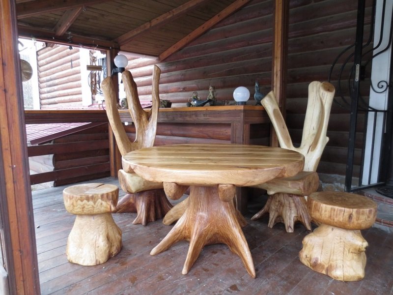- Вот такой чудесный комплект можно сделать из пней и коряг. Покрыл лаком — и готово.