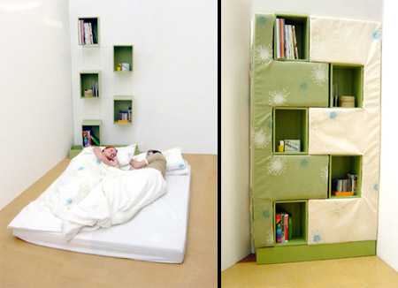 Кровать в виде книжного шкафа. Дизайнер Карен Бабел (Karen Babel) придумала интересную модель кровати, позволяющую днем экономить пространство комнаты. В течение дня элементы кровати являются составной частью книжных полок. А вечером достаточно опустить половинки кровати и сдвинуть их, чтобы получилось отличное ложе.