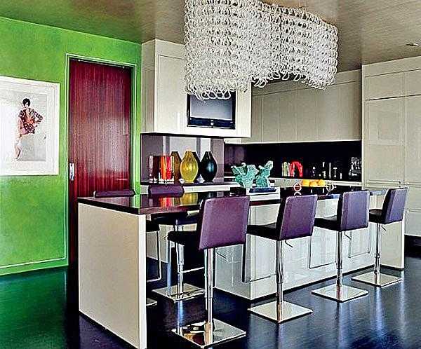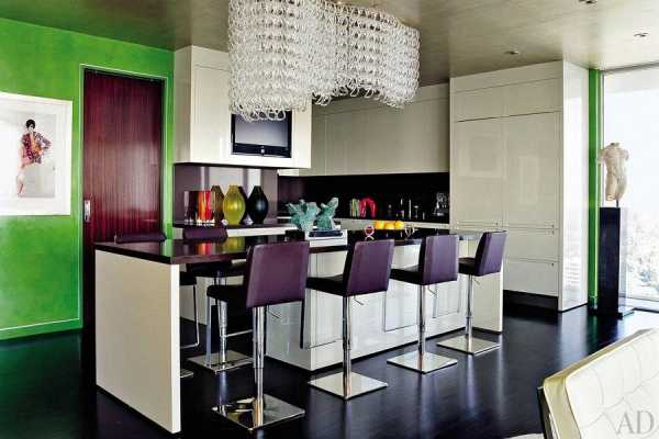 Эпатажность сэра Элтона Джона прослеживается во всем и его дом в стиле 70-х годов в Лос-Анджелесе не исключение. Цветовая гамма кухни построена на ярком кричащем сочетании зеленого и фиолетового. Внимание привлекает гордость хозяев — большая хрустальная люстра, висевшая когда-то в миланском гранд отеле.