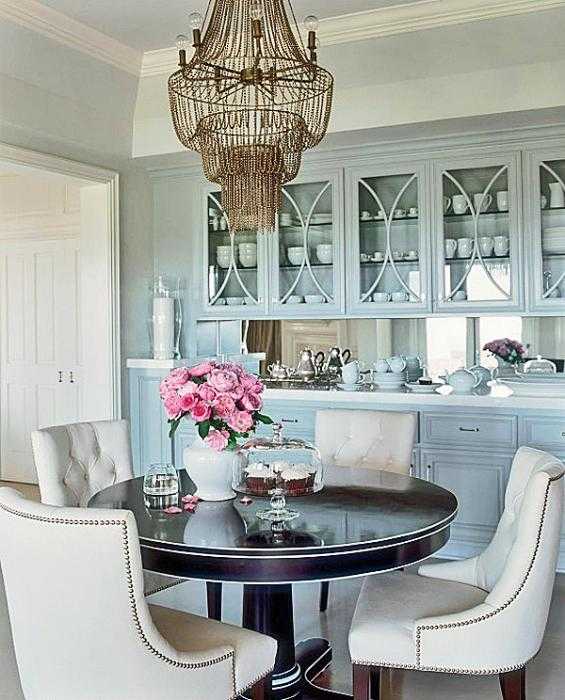 В калифорнийском доме Дженнифер Лопез все стильно и гламурно, как и во всем остальном, что окружает знаменитую актрису. Для кухни в английском стиле она выбрала прохладное сочетание серого и голубого. Получился очень приятный романтический интерьер, воздушный и свежий. Интересная деталь — две мойки: одна у окна, вторая на «островке». Должно быть очень удобно, особенно когда на кухне одновременно присутствует несколько человек. В другой части комнаты находится буфет и небольшой круглый столик на четверых с уютными кожаными креслами.