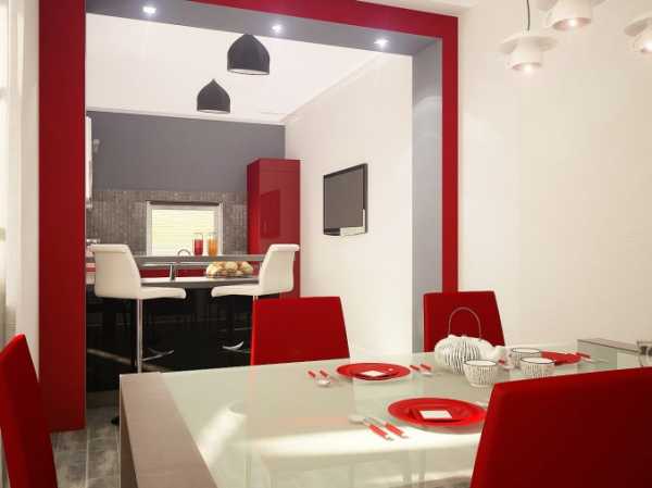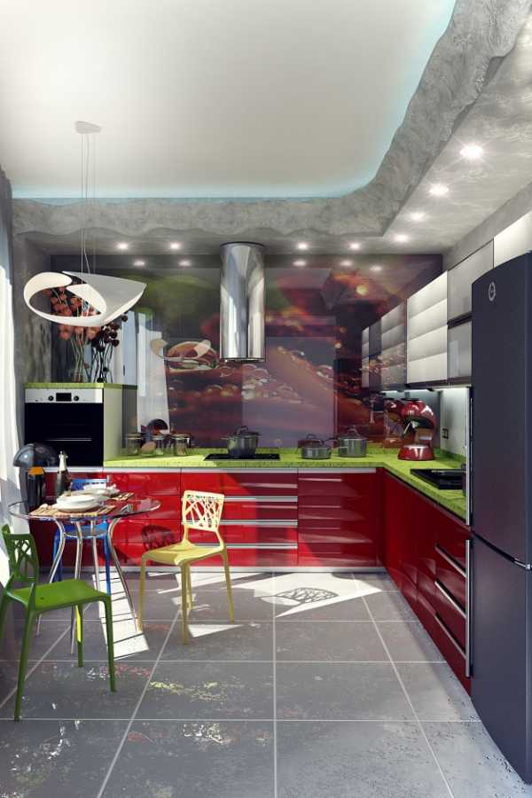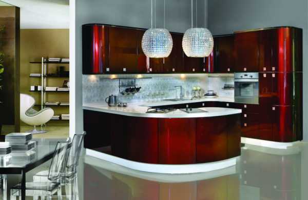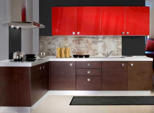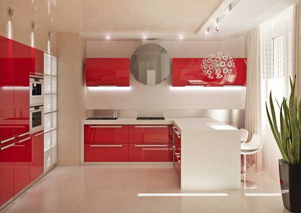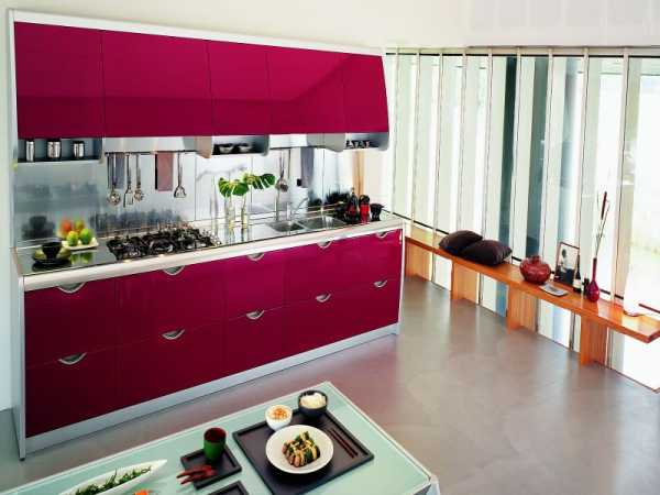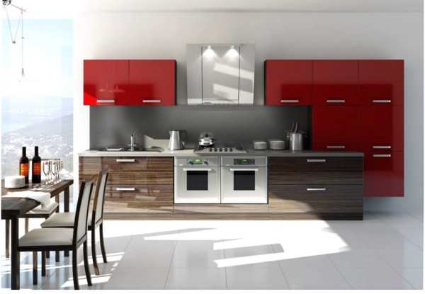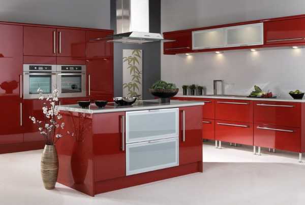 В сочетании с белым и металликом, глянцевый красный цвет придаст интерьеру кухни жизнерадостную яркость. Оттенок можно подобрать любой — от классического алого до благородного бордо или легкомысленного розового. В маленьких помещениях желательно использовать светлые, приглушенные тона для небольших акцентов или отдельных шкафчиков.