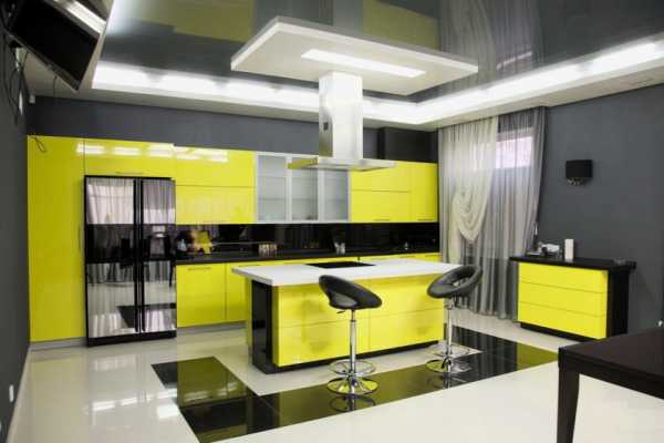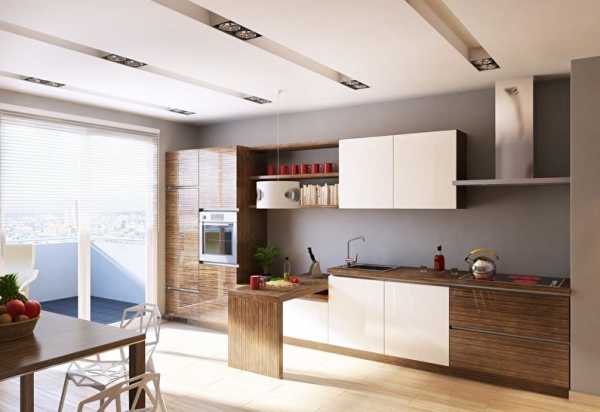 Если на кухне низкий потолок, высоту желательно уравновесить крупными элементами по вертикали (холодильник, шкаф-пенал, вытяжка с длинной трубой). В маленьком пространстве гарнитур лучше расположить Г-образно, максимально используя место по углам. Если же площадь помещения большая, подойдут и другие виды планировки.