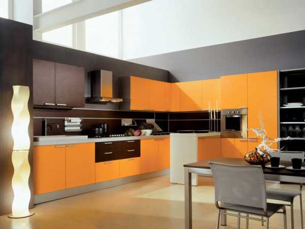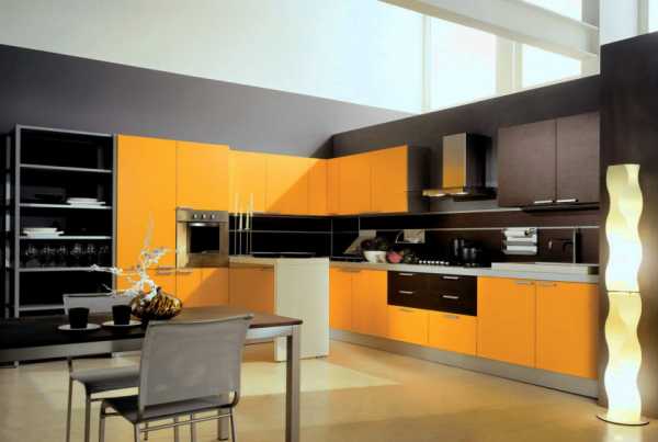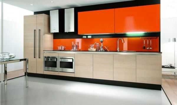 Черный цвет в модерне чаще используется в акцентных контрастах, подчеркивая белый и стальной. Но встречаются и довольно авангардные варианты в виде гарнитуров оттенка угля. Иногда они могут быть разбавлены деревянными текстурами или крупными цветными элементами (например, часть фасадов окрашена в оранжевый, красный, желтый). Применять черный лучше в просторных помещениях.