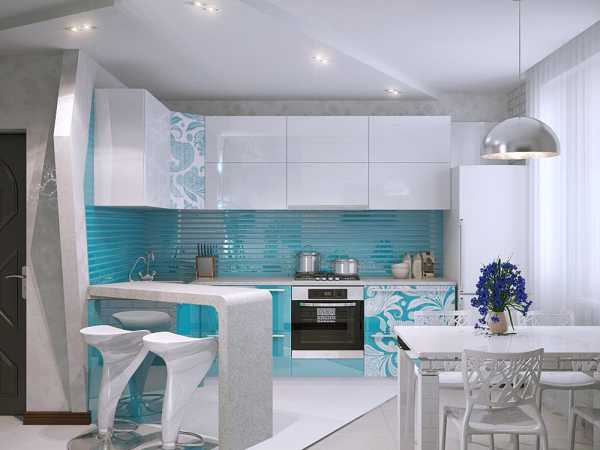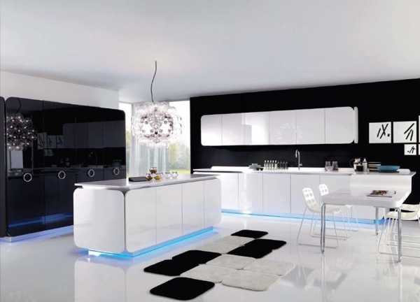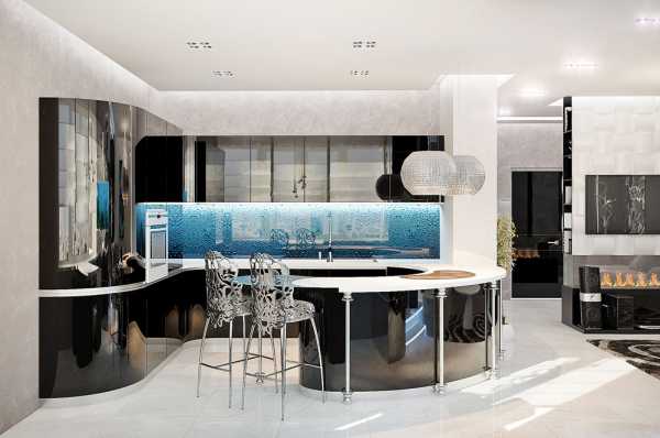 Все фото На фото: Светлая кухня в стиле модернОстровная двухуровневая барная стойка полукруглой формы с голубой LED-подсветкой – главное украшение кухни на фото. Но этот элемент интерьера несет и существенную функциональную нагрузку: в стойку встроена система хранения, а ее столешницу можно использовать как дополнительную рабочую поверхность.