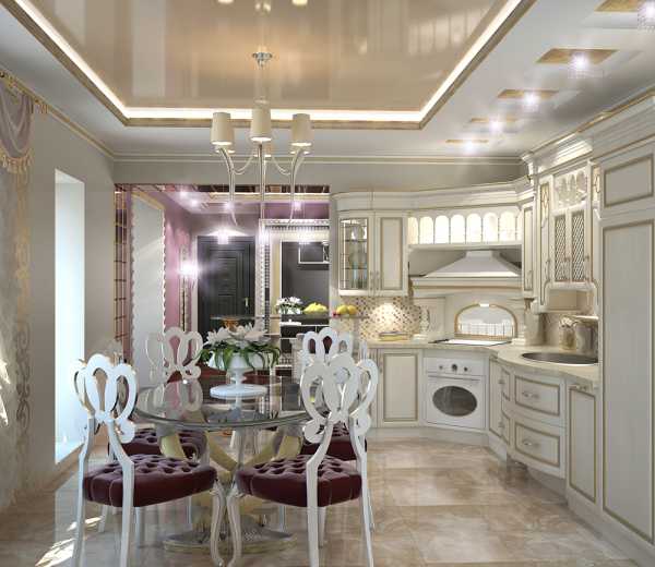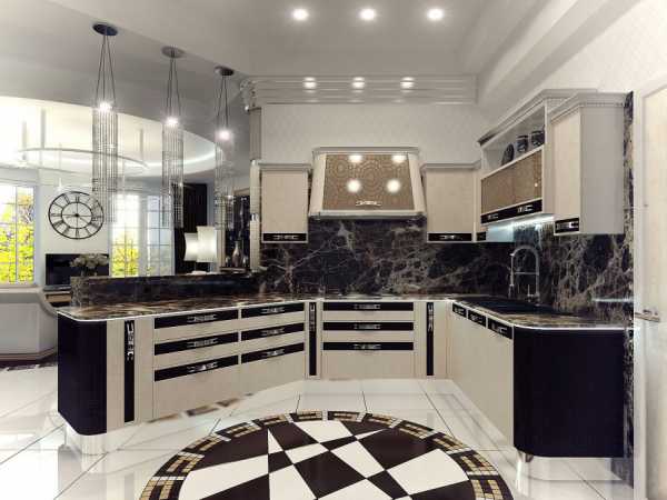 Все фото На фото: Интерьер роскошной кухни в жемчужных тонахОформленная в жемчужных тонах кухня модерн смотрится в высшей степени аристократично. А роли ярких деталей в таком интерьере могут сыграть роскошные хрустальные люстры в стиле арт-деко, черная стеклянная столешница и ножки стульев.