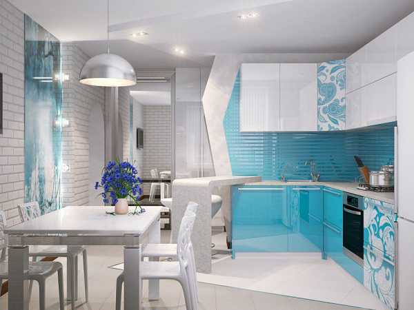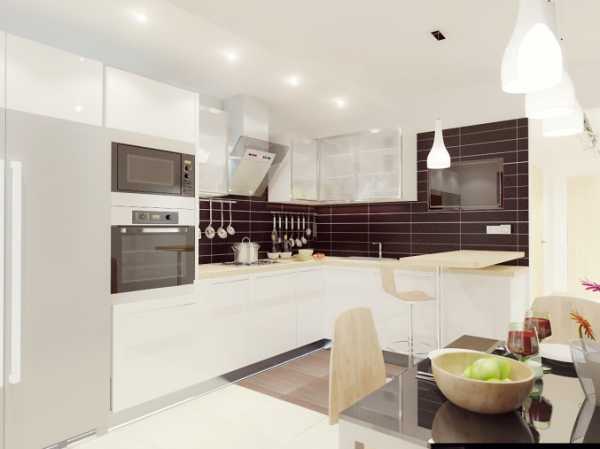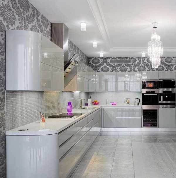 Блестящая белоснежная кухня — лучший вариант для маленькой площади. Стилистику модерна в ней подчеркнут металлические элементы, скругленные углы, а также стеклянные поверхности. Чтобы при этом не возникало ощущение стерильности процедурного кабинета, можно добавить немного дерева (пол, столешницы), ярко оформить фартук, поставить цветную посуду и кресла.