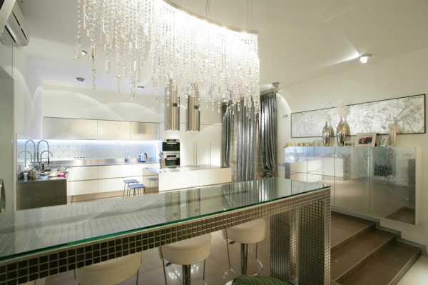 Отдельные элементы (ручки на гарнитуре, ножки, профили дверок) могут быть стеклянными или металлическими. Стеклянные поверхности уместны — и светопроницаемые, и матовые: их используют, как вставки в мебельных секциях, для декорирования барной стойки, обеденного стола, световых приборов и поверхностей стен.