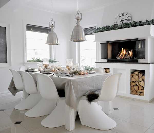 Скатерть в данном стиле не предусматривается, как и чехлы на кресла, диванные подушки и т.д.