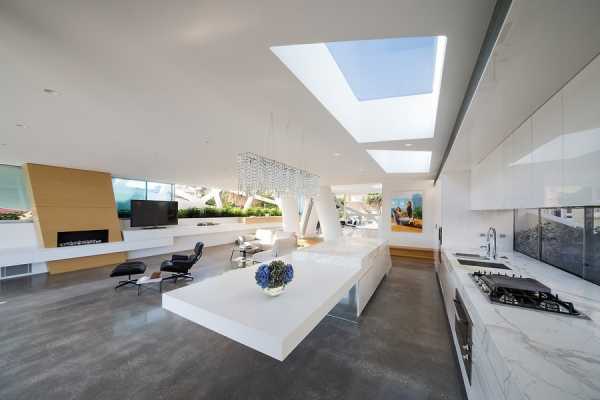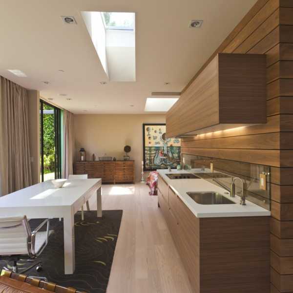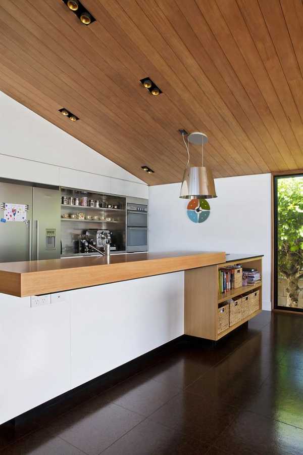 Еще можно ограничиться простой покраской или же устроить подвесную гипсокартонную конструкцию овальной либо асимметричной формы (например, над обеденной зоной). Также сюда гармонично впишется и реечный потолок с металлическими или пластиковыми элементами.