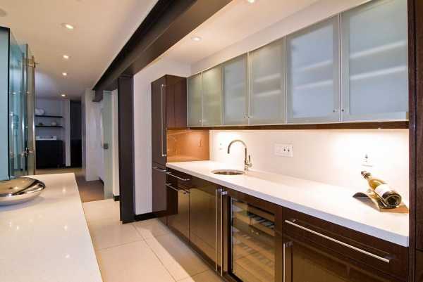 Все фото На фото: Стеклянные перегородки с подсветкой в интерьере кухни в стиле модернТеплые карамельные оттенки прекрасно подходят как для оформления интерьера в классическом стиле, так и для современной кухни в стиле модерн. Они хорошо сочетаются со светлым мрамором и LED-подсветкой, с помощью которой можно выделить фартук или визуально облегчить массивные шкафы.