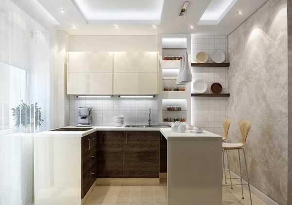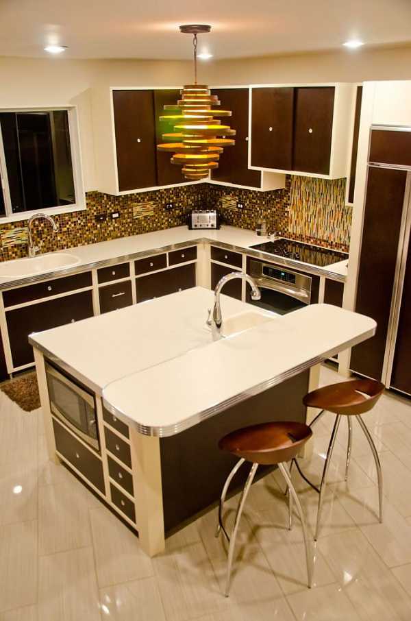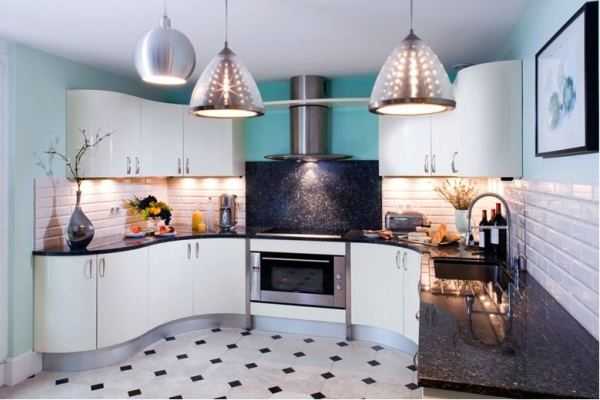 Одной люстрой даже на небольшой угловой кухне нельзя ограничиваться. Желательно использовать дополнительную подсветку над рабочей и обеденной зонами. Для этого отлично подойдут точечные софиты и люстра в стиле модерн, имеющие исключительно простые геометрические формы, без вычурности и излишеств.