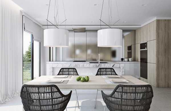 По центру кухни, а также над столовой зоной будет уместна подвесная люстра — стальная, керамическая либо стеклянная, обтекаемой формы, в виде стальной трубы или настольной лампы.